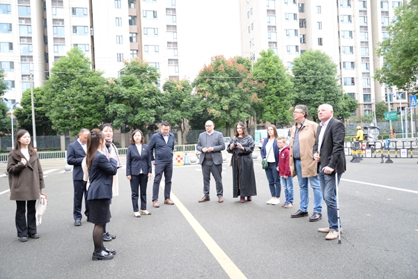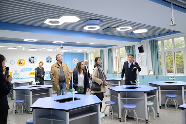 活动在凉凉秋意中温情启幕。学校党委书记龚学泰、校长袁晓蓉、副校长雷晓棠、副校长杨珊等校领导与师生代表一早守候在校门,热情迎接远道而来的法国芙拉斯堡市及郑州市管城区教育局代表团。双方亲切交流、互致问候,校园中洋溢着友好而温暖的气氛。在校领导的陪同下,嘉宾们信步校园,沉浸于浓厚的文化氛围之中。五位青年党员教师全程引领,为来宾详细介绍学校办学理念、设施建设与育人成果,充分展现了学校现代化教育环境与人文关怀并重的办学特色。