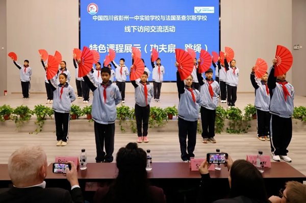 法方师生代表走进中方课堂,亲身体验特色课程。在功夫扇课堂上,中法学生结对练习,一招一式间既有武术的刚劲,又融入扇舞的柔美;跳绳社团则展示了花样跳绳技巧,双摇、交叉跳、长绳绕“8”字跳等高难度动作引得法方师生跃跃欲试。贝瑞缇·萨拉女士表示:“这些课程不仅锻炼了体能,更让学生体会到团队协作与文化传承的乐趣,值得我们借鉴。”