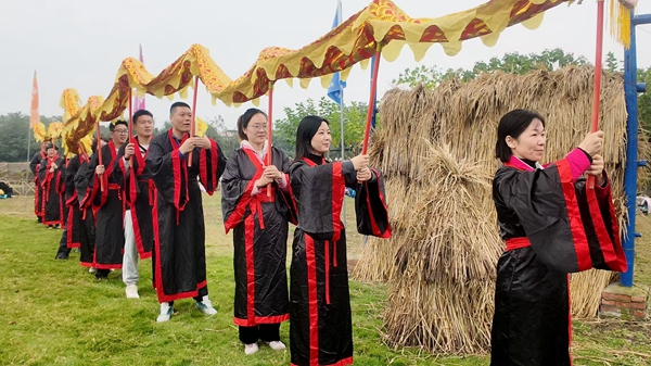 活动开始前,启点营地的老师们带领全校师生一起开展了秋日“丰收仪式”,仪式中,同学们不仅了解了大自然对人类的馈赠,还依照古法礼仪进行了祭拜仪式;仪式还邀请了平日里执笔授课的老师们化身舞龙能手——他们高举精心扎制的长龙,在锣鼓喧天中步伐矫健地穿梭于田间。龙身随节奏起伏翻飞,犹如游弋于稻浪之上,引得现场学生和观众的阵阵喝彩。