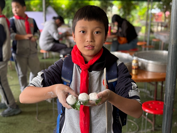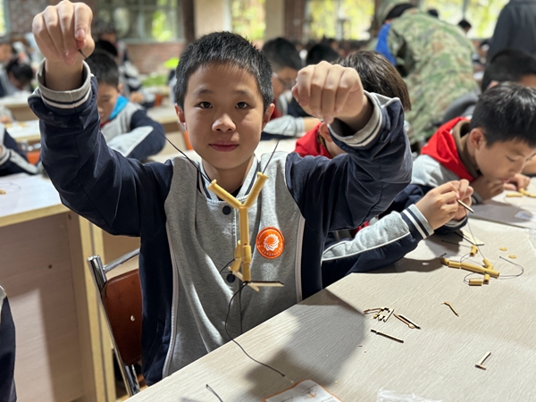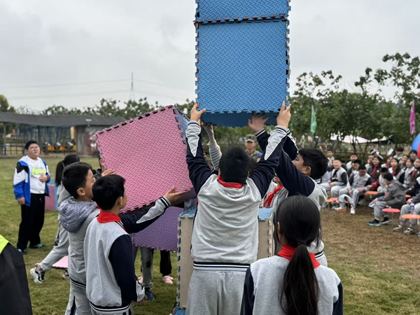 4-6年级的同学则沉浸在稻谷的海洋中,体验传统的收割农事。他们在老师的指导下收获稻谷,“打谷子时抬高、放下,使劲儿打,然后再翻过来抖一下。”——一旁的老师细心地指导着动作要领。美食制作区内,同学们大展身手,学习制作崇州特色传统美食——叶儿粑。将馅料细心裹进糯米团,再用粑叶包裹成型,每一个步骤都一丝不苟。手工课上,同学们还体验了制作竹节人的乐趣。将竹子截成小段,用棉线串联,再为竹节人添加各种装饰。活动最后,4-6年级的同学们则挑战了需要更多团队协作的“通天塔”和“运转乾坤”项目。这些活动不仅考验体力,更考验团队协作能力和战略思维。赛场上,青春的活力与朝气尽情绽放。