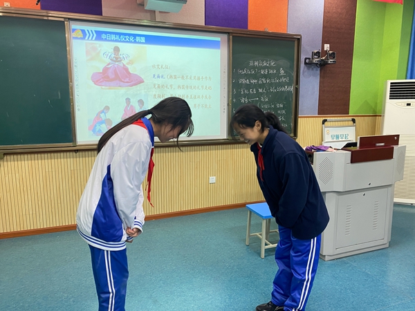 课程伊始,钱老师一句亲切的韩语问候瞬间抓住了所有同学的注意力,新颖的开场方式引来了阵阵好奇的目光。在钱老师的带领下,同学们兴致勃勃地学习了“你好”、“谢谢”等简单的韩语和日语日常用语。这扇“语言之门”的开启,不仅活跃了课堂气氛,更让同学们直观地感受到不同文化背景下的交流方式,为接下来的礼仪文化学习做好了铺垫。