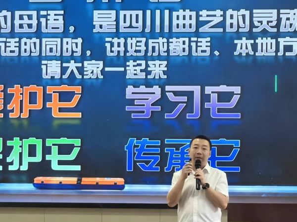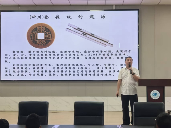 讲座中,谢赤非老师系统梳理了四川竹琴与金钱板的文化脉络。他介绍,竹琴历史可追溯至汉代,是四川地区独有的传统乐器,其音清越悠扬,承载着厚重的历史记忆;金钱板则由快板、莲花闹演变而来,迄今已有300多年历史,因竹片内置铜钱、击打时作响而得名,是川渝民间极具特色的说唱曲艺。结合史料与实例,谢老师生动讲述了两种非遗艺术在时代变迁中的发展轨迹,以及从传统单一演绎到融入现代元素的创新之路。