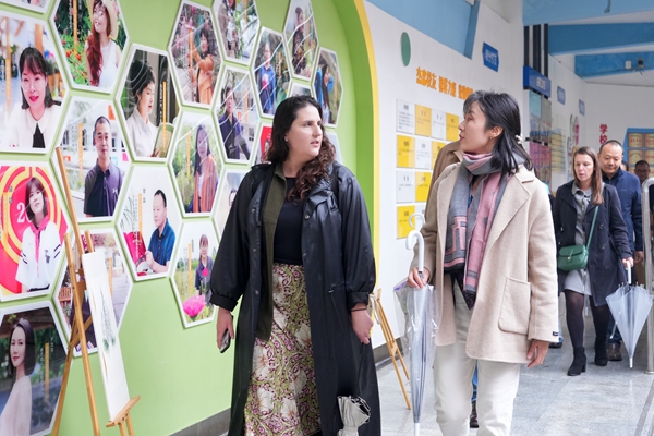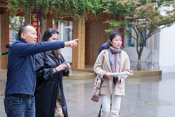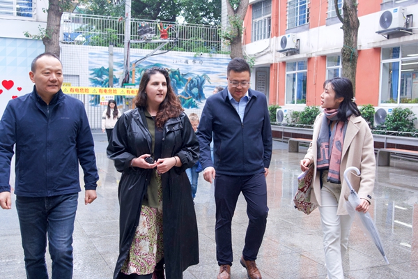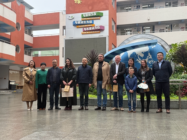 在学校党委书记杨先凤、校长胥勇的带领下,管理团队热情迎接法国代表团。天空细雨霏霏,但宾主相逢的热情早已驱散微寒。胥校长以百年皂荚树为开场,分享其与学校共成长的岁月,为此次交流绘就了一幅温暖底色。