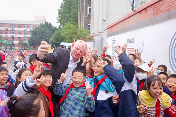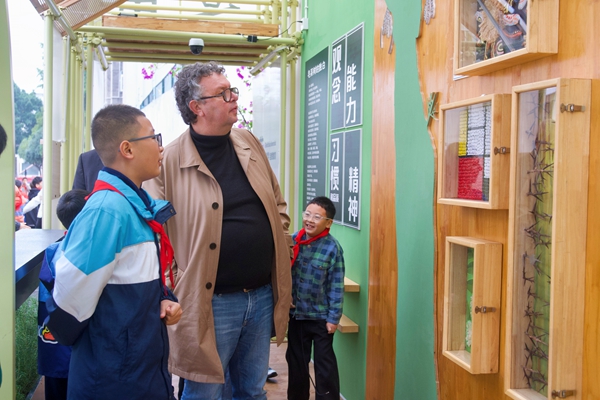 校园漫步惊喜连连!代表团前脚刚为学生的法语小报和掐丝珐琅画赞叹不已,后脚就迎来了温馨互动:法国学生布里奥·阿蒂尔走进教室,立刻被中国同学的热情问候包围,代表团成员们也纷纷加入,现场秒变“蹭课”现场,沉浸式感受了中国课堂的活力。