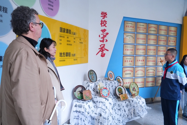 学校“造角”基地成为文化体验的重要一站。代表团观摩学生以皂角为原料的创意作品,并参与非遗漆扇制作。在何婷婷老师的指导下,成员们动手调色、绘制,频频交流,展现出对中国传统工艺的浓厚兴趣。