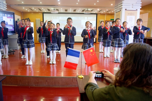 活动尾声,实小法语合唱团以中法双语演唱《夜空中最亮的星》,清澈的歌声赢得全场掌声。双方互赠礼物——实小学生制作的掐丝珐琅画,法国代表团带来的手印画与手工艺品,传递出对友谊的共同珍视。