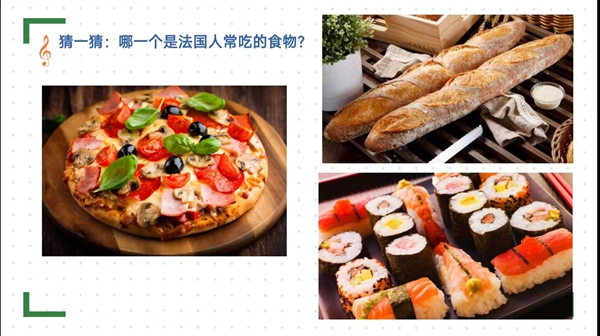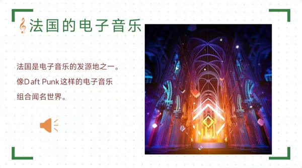 与此同时,二年级3班的教室里正回荡着经典香颂《玫瑰人生》的旋律。何老师以“音乐是世界的语言”为引,先带学生复习法国地理与美食知识,随后切入音乐主题。从香颂的浪漫抒情到电子音乐的先锋活力,从法国音乐节的狂欢氛围到手风琴、竖琴等特色乐器展示,孩子们通过聆听片段、模仿演奏动作,沉浸在法国音乐的多元魅力中。