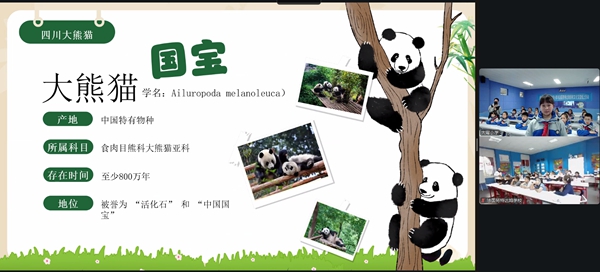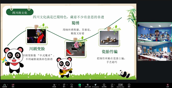 活动伊始,我校五年级三班的何田田同学化身“四川文化小使者”,带领法国师生开启沉浸式文化之旅。她从巴蜀文脉切入,将川剧变脸“瞬息万变的脸谱”、蜀绣“针脚细密的艳丽纹样”、瓷胎竹编“经纬交织的精巧匠心”娓娓道来,搭配生动的图片,让非遗技艺的魅力穿越屏幕。谈及美食,她更是绘声绘色地描述了火锅“麻辣鲜香、热气腾腾的热闹氛围”,乐山甜皮鸭“皮脆肉嫩、甜咸交织的独特风味”,引得法国小伙伴隔着屏幕频频点头。当话题转向大熊猫,何田田同学细致讲解了国宝“圆滚滚的身躯、黑白分明的皮毛,啃食竹子时腮帮子鼓鼓的憨态”,从栖息地保护到繁育故事,全方位展现了四川的自然灵秀与人文底蕴,法国师生不时发出阵阵惊叹。
