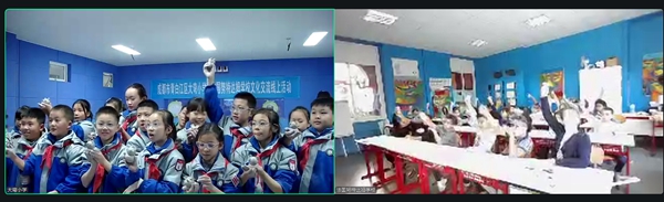 互动问答环节更是点燃全场热度,成为跨国友谊的“升温器”。我校同学好奇追问“学校开设了哪些特别的课程”“法国的美食有哪些”;法国小伙伴问道“四川人每天都吃火锅吗”“科学课会做哪些有趣的实验”。双语对话交织,好奇与真诚碰撞,一个个“文化漂流瓶”载着童真与热情,在亚欧大陆间传递,让陌生感悄然消融,友谊在欢声笑语中生根。