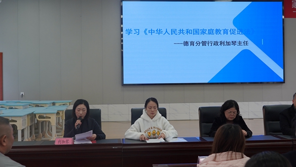 彭州市家长学校家庭教育指导师张劲秋从责任、配合、规矩、适应四大方面切入,提出一套系统化的智慧育儿策略,为家长们提供了切实可行的教育指南。成都市家长学校彭州分校的付颖燕主任就家庭教育的重要性做了强调。德育分管行政利加琴副主任,带领大家共同学习《中华人民共和国家庭教育促进法》,明确家长在家庭教育中的责任与义务。校长林海为本次会议作总结发言,强调家校配合的重要性,增强家校合力,赋能学生成长。