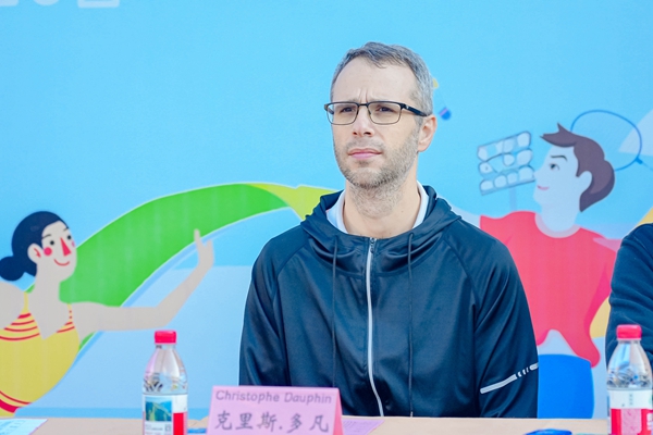 在“全国追光少年阳光跑”授旗仪式和运动员宣誓环节后,运动会迎来了温馨而富有意义的一幕——法国友人Chris老师登上主席台与全校师生见面。Chris老师特意身穿印有中国国旗的运动员服装,这一细节瞬间拉近了他与孩子们的距离,看台上响起了热烈而持久的掌声。