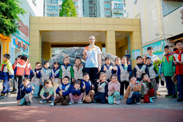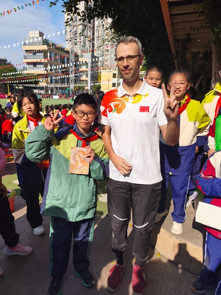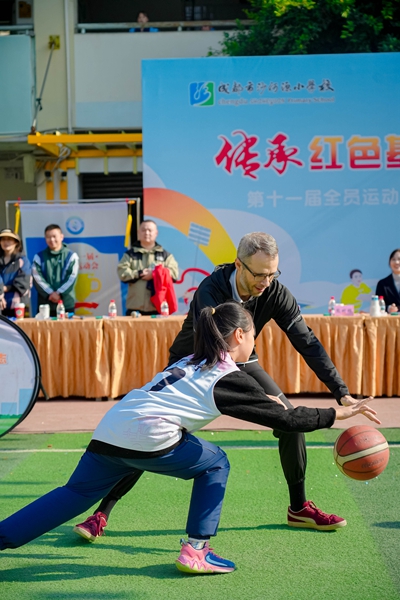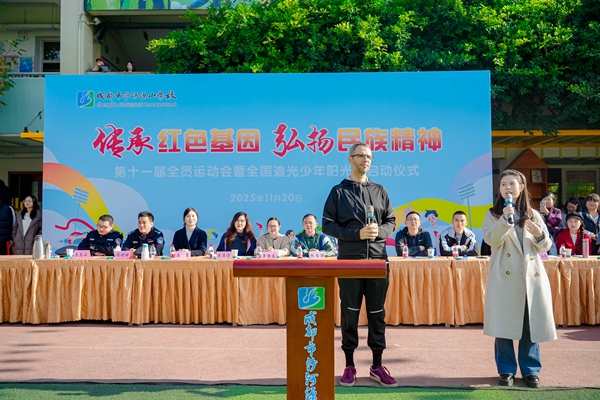 四川教育新闻成都11月21日讯(魏雅莉)2025年11月20日,成都市沙河源小学校第十一届“传承红色基因 弘扬民族精神”全员运动会隆重举行。与往年不同,本届运动会迎来了一位特别的客人——法国友人Chris老师,他的到来为这场红色主题盛会注入了跨越国界的温暖与活力,也成为中法青少年人文交流的生动实践。