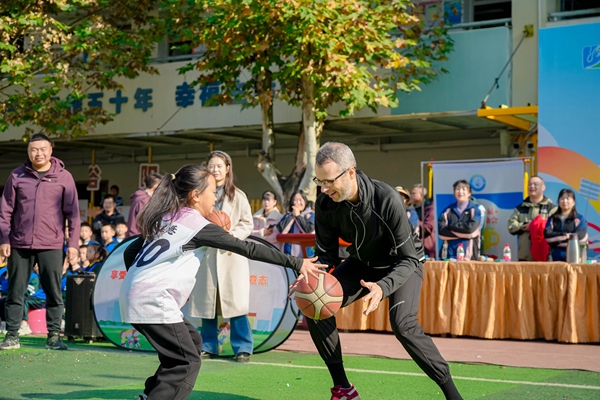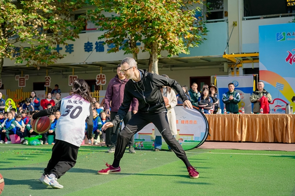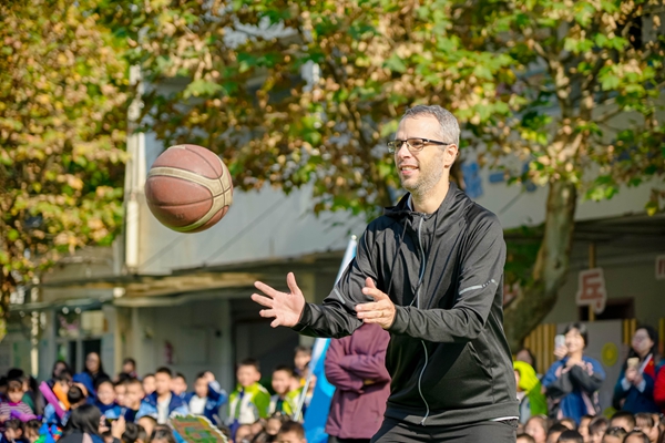 在随后的互动环节中,Chris老师积极参与到学生们的体育展演中。在“篮排竞跃·活力绽放”环节,他与小运动员们一起运球、传球、投篮,用篮球搭建起友谊的桥梁。尽管语言不同,但运动与笑容成为了最好的交流方式。更令人感动的是,Chris老师还专门与沙河源幼儿园的孩子们进行了亲切互动,耐心地蹲下身与小朋友们交流,展现了一位国际友人的细腻与温暖。