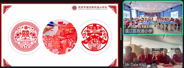 剪纸课程在朱老师充满趣味的提问中拉开帷幕。“我们之间的距离有多远?”“对方国家的春天在几月?”两地孩子们踊跃互动,在猜想与揭秘中,不仅了解了彼此的地理和气候差异,更点燃了对彼此文化的好奇心。