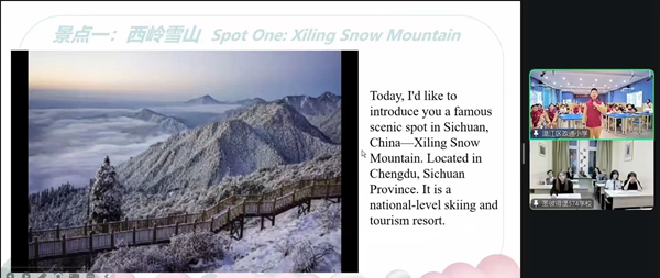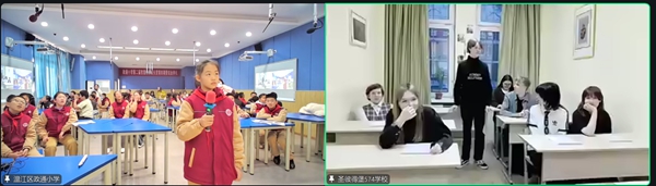 在线上交流环节中,两校学生化身“家乡文化小使者”,通过精心准备的视频和PPT,热情地向屏幕另一端的伙伴们展示了自己家乡的风土人情。尽管相隔万里,但云端两端洋溢着好奇与友好的气氛,欢声笑语不断。