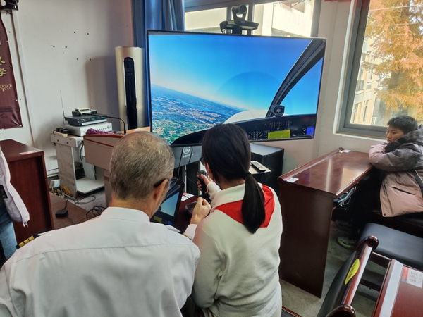 “现在,你们都是‘小机长’!”随着Chris的邀请,被选中的同学们相继上前,紧握模拟手柄,在专业软件的辅助下体验飞机起飞、巡航、降落的全过程。大屏幕上,虚拟客机在跑道上加速滑行、冲破云层,同学们屏息凝神,随着Chris的指令调整操作:“拉升机头!注意仪表盘速度!”“准备降落,放下起落架!”当飞机平稳降落在“虚拟机场”时,会议室里爆发出欢呼声。