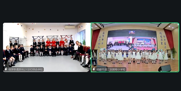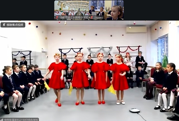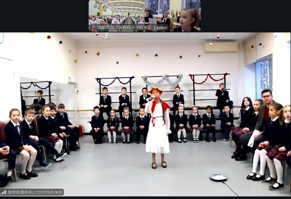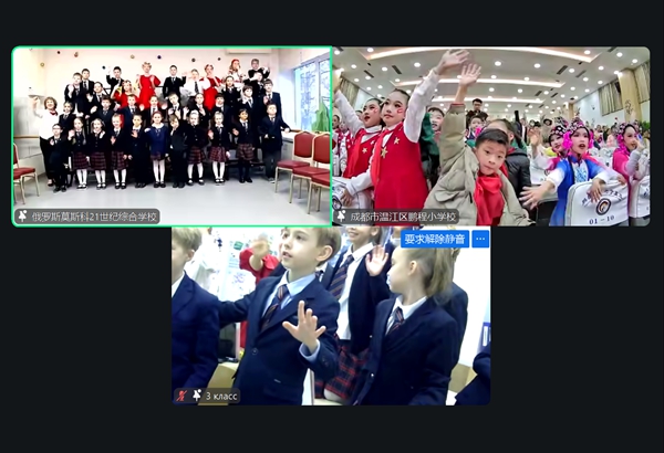 二年级和四年级的300名学生代表,通过神奇的大屏幕,和友好学校俄罗斯莫斯科二十一世纪综合学校的小伙伴们开展线上迎新歌会啦!