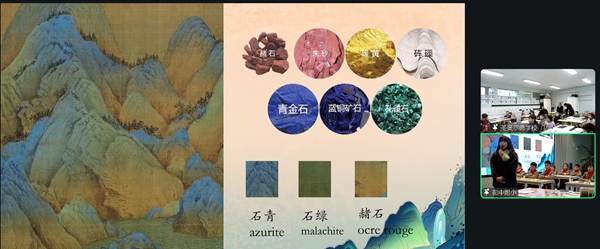 课程伊始,吴老师播放的湔江风光短片,瞬间吸引了两国学生的目光。江水如练,秋林尽染,美不胜收。随后,中国学生化身“文化小使者”,主动对比了宋代名画《千里江山图》与湔江实景的意境关联。当吴老师借助AI技术将湔江实景转化为青绿山水风格时,现场响起阵阵惊叹——原来自然与艺术,竟能如此交融。