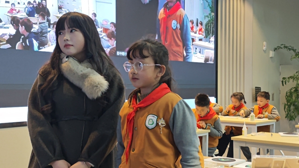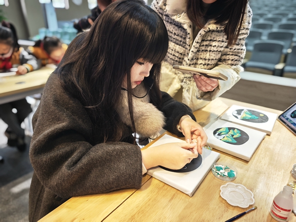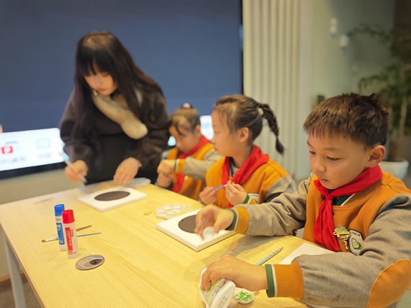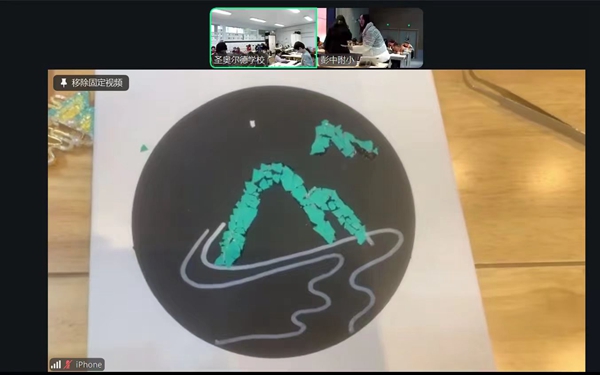 在清晰的步骤示范后,孩子们热情投入创作。他们用镊子细心拼贴,以疏密表现远山近水,用银线勾勒江河婉转。屏幕两端,专注与乐趣交织,一幅幅各具特色的蛋壳山水在指尖成型。