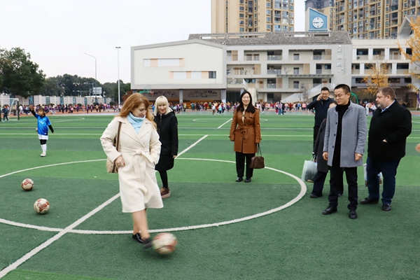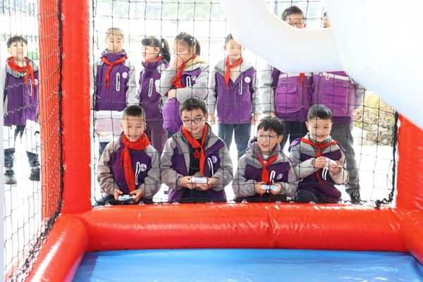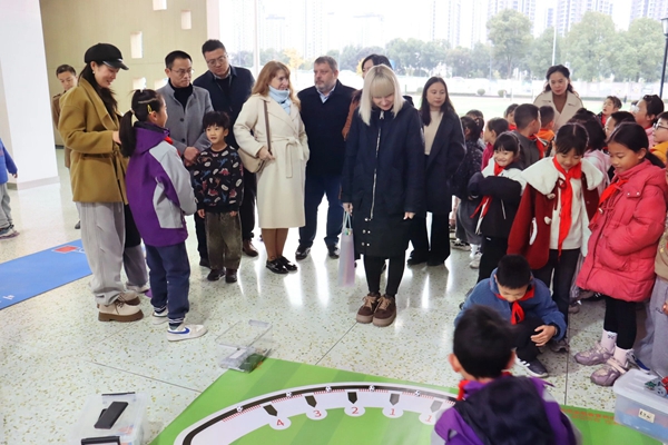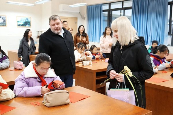 在美术功能教室和体育馆,外宾分别参与了棕编技艺、剪纸艺术、模型制作、无人机足球四项特色课程体验。来宾在师生指导下亲手尝试,在互动中感受中华文化的魅力与现代教育的活力。