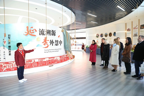 在学校中外人文交流中心和博物展陈馆内,延秀娃娃们担任英语解说员,清晰生动地为来宾进行介绍。这里既陈列着来自世界各国友校赠予的珍贵礼物,每一件都承载着一段跨越山海的情谊,更有学校师生对彭州文物的探索成果,每一处细节都彰显着中华传统文化的深厚底蕴。