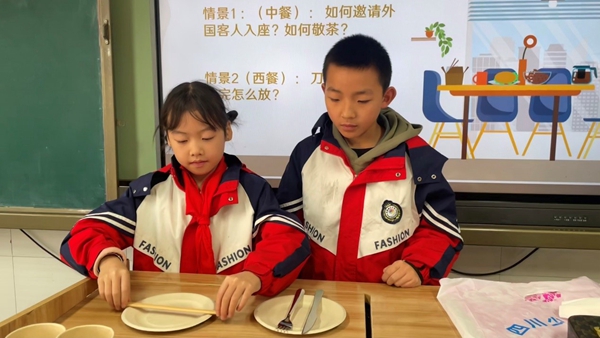 四川教育新闻成都12月11日讯(魏雅莉 通讯员 刘启迪)为提升学生人文素养、坚定文化自信、涵养家国情怀,2025年12月10日,五丁学子在四川少儿电视《阳光起跑线》钱老师的引领下,以“跨文化理解”为核心,围绕“问候礼仪”与“餐桌礼仪”两大主线,开展了两节生动有趣的主题课程。课程引导学生在沉浸式体验中感知中西文化差异,在互动交流中深化国际理解认知,切实达成 “知礼明仪、融贯中西”的育人目标。