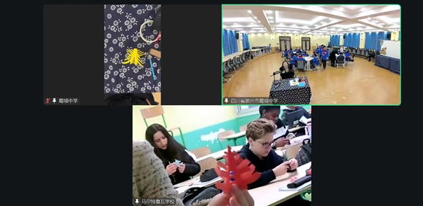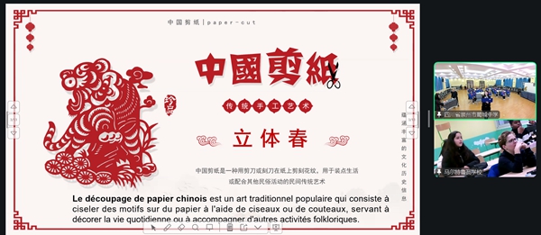 四川教育新闻成都12月19日讯(黄小林)为搭建中法青少年文化交流桥梁,增进两国师生的相互了解与友谊,一场主题为“非遗指尖秀・中法云相约”的跨国文化交流活动于云端顺利举办。本次活动由四川省崇州市蜀城中学主办,法国马尔特鲁瓦学校师生与蜀城中学初中部学子齐聚线上,共同领略中国非遗文化的独特魅力。