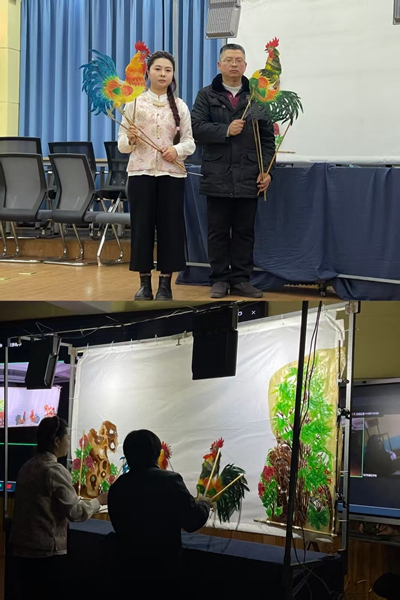 活动在精彩的皮影戏表演中拉开帷幕。崇州市皮影戏非遗传承人杨勇、杨瀚博老师带来经典片段《勤鸡斗懒鸡》,生动演绎了勤劳勇敢的花公鸡智斗懒惰专横的黑公鸡,成功守护劳动果实的故事。表演充分发挥动物皮影夸张简洁幽默的风格,以灵动的动作搭配应景的背景音乐,将国家级非物质文化遗产皮影戏的独特韵味展现得淋漓尽致,赢得了中法师生的阵阵赞叹。