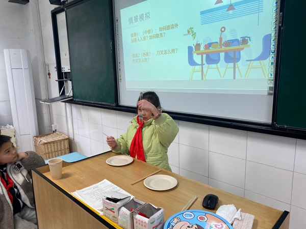活动过程中钱老师通过PPT和趣味短视频,抛出一系列引人深思的问题:“为什么我们用筷子,西方人多用刀叉?”“餐桌上的座位安排有什么讲究?”“吃饭时发出的声音,在不同文化里会被如何看待?”这些问题瞬间点燃了孩子们的好奇心,大家争相举手,结合自己的生活经验和模糊认知,分享着最初的想法,课堂气氛迅速升温。
