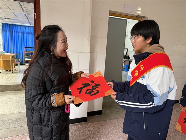 学校书法班的同学们展纸挥毫,笔走龙蛇,书写了一幅幅寓意吉祥的春联和满载祝愿的“福”字。这些手写的祝福,由同学们亲手送至各办公室老师手中。这一活动不仅是对书法艺术的实践,更是尊师重教传统的生动体现,为老师们送去了新年的第一缕暖意。