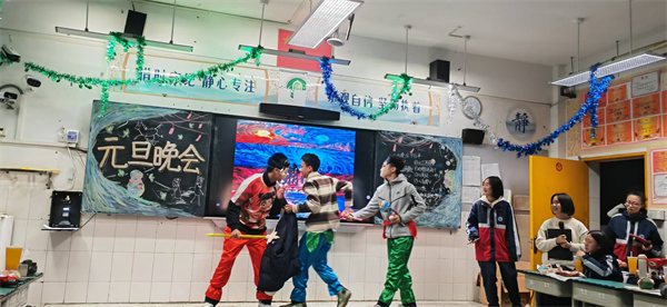傍晚18:50,欢快的节日音乐准时响起,流淌在每一间精心装饰的教室。这熟悉的旋律瞬间点燃了全校的热情,欢声笑语驱散了冬夜的寒意,正式拉开了“青春逐梦迎新年,同心聚力向未来”元旦联欢晚会的序幕。