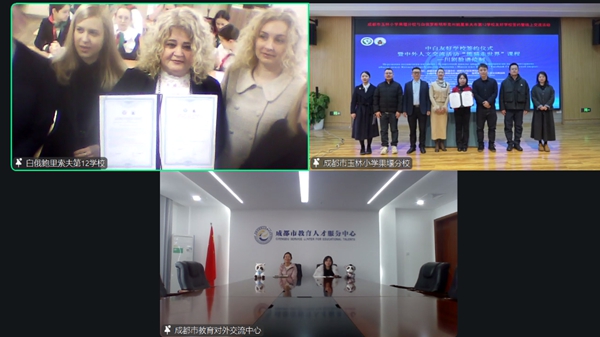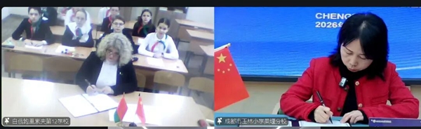 四川教育新闻成都1月14日讯(易彬 通讯员 周琴 郭洁)跨越亚欧大陆的距离,以教育为桥,以文化为媒,2026年1月12日,在成都市教育对外交流中心、武侯区教育局、白俄罗斯明斯克州教育发展研究中心的指导支持下,经环球青少年大使计划四川中心协助,成都市玉林小学果堰分校与白俄罗斯明斯克州鲍里索夫市第12学校通过云端连线,成功举办友好学校签约仪式暨线上交流活动,两国师生跨越山海相聚,共同开启教育合作与文化交融的崭新篇章。