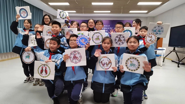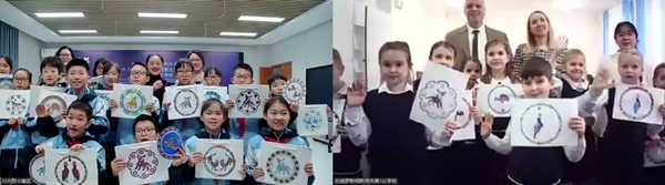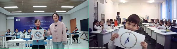 中场休息后,一场别开生面的文化交流活动拉开了序幕。川大附小南区学校彭应美老师带来了一堂精彩的《蜀锦》课程。彭老师通过生动的讲解与互动展示了蜀锦的悠久历史、精湛工艺与文化内涵。她重点介绍了蜀锦特有的团窠纹,并讲解了蜀锦织造中常见的瑞兽纹样及其背后蕴含的深厚文化寓意。在彭老师的示范与指导下,两国学生纷纷创作出了属于自己的独特装饰纹样,并相互展示与讲解了各自的作品,在云端共同感受中华传统织造技艺的魅力,在文化交流中增进了理解与友谊。