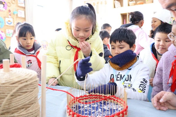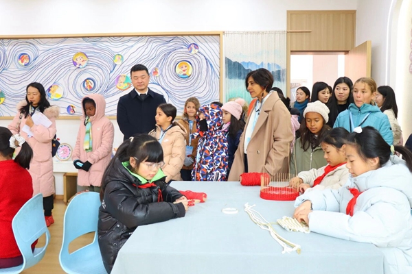 代表团走进学校绳编教室,在美术教师刘菲的专业指导下,体验了中国传统手工编织技艺。从线材选择到编织手法,法国师生认真学习、反复尝试,亲手制作杯垫、挂件等简易绳编作品,在一针一线的穿梭中,感受“变废为宝”的创意乐趣与中华传统手工艺的独特魅力。