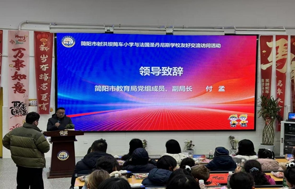 简阳市教育局党组成员、副局长付孟热情致辞。他代表市教育局对法国圣丹尼斯学校师生到来表示热烈欢迎。他寄语道:“希望以此次交流为契机,让更多法国友人了解简阳、爱上简阳,让文化的种子在彼此心中生根发芽,让教育的纽带联结起更远的未来。”