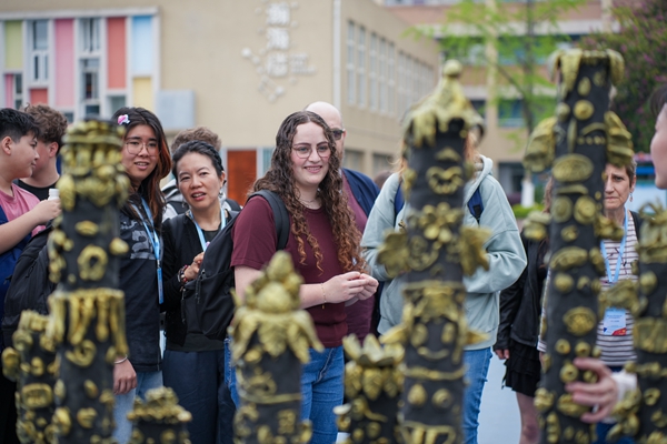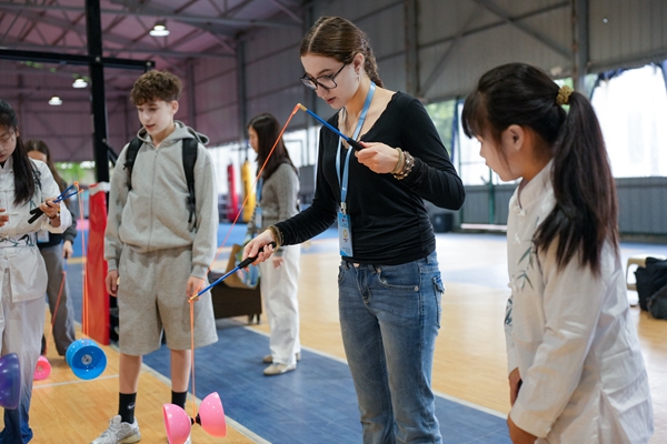 接着,代表团观看了付继建老师与空竹社团带来的空竹表演。小小空竹翻飞灵动,声响清脆,赢得阵阵掌声与喝彩。表演结束后,代表团成员迫不及待地亲身体验。空竹社团的同学们化身文化小使者,耐心展示并讲解动作技巧,在传承传统体育文化的同时,也让法国师生近距离感受到中华非遗的魅力。