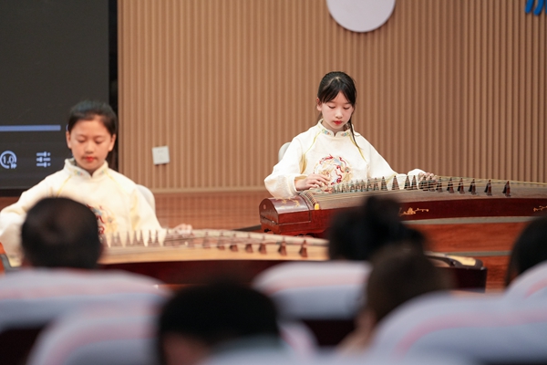 在张天茹主任的指导下,舞蹈社团的同学们翩翩而来,带来《小雅鹿鸣》。“呦呦鹿鸣,食野之苹……”优美的舞姿与古雅的吟唱相融,让代表团在表演中感受中国的诗词文化。赵林、赵诗雨老师携葫芦丝社团深情演绎《美丽的神话》。两位老师演奏投入,姿态优雅,葫芦丝音色婉转悠扬,如诉如慕。古筝社团随后奏响《大鱼》,琴声清澈空灵,如流水般潺潺流淌。两曲交织,余韵绕梁,现场洋溢着浓厚的艺术氛围。