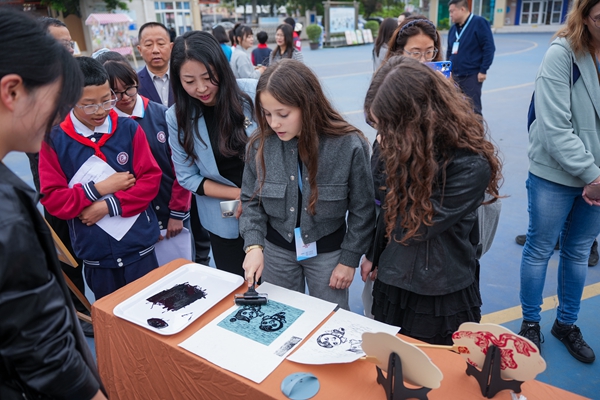 法国马尔特鲁瓦学校师生代表团从校门口出发,开启了校园参观之旅。辰居小学的同学自信大方的向他们介绍了介绍了学校的办学理念、星辰文化以及二十四节气、国际理解、版画、戳戳绣、剪纸等特色课程作品。代表团亲身体验版画、戳戳绣以及创意粘土,近距离感受中国传统文化手工的乐趣,他们对辰小师生的巧手与创意赞叹不已。