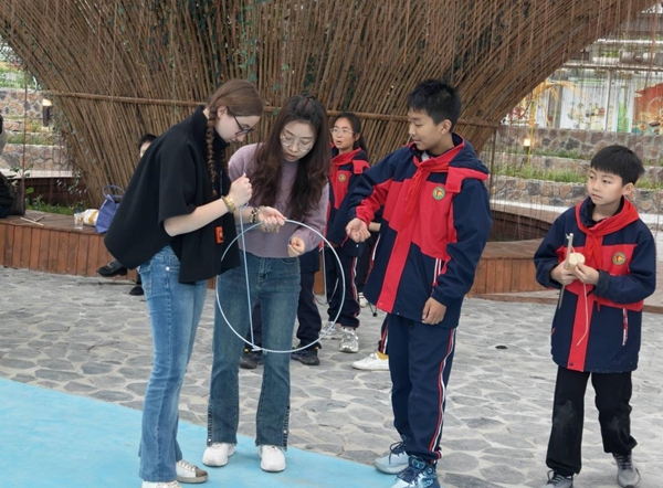 随后,两校学生分组开展乡村传统特色游戏,抽陀螺、滚铁环等充满童趣与乡村气息的互动项目轮番上演。孩子们自由组队、默契配合,在奔跑嬉闹中尽情释放活力。特色游戏不仅让大家沉浸式体验了传统民间游戏的独特魅力,更在轻松愉快的氛围里拉近距离、增进情谊,留下了温暖而难忘的美好回忆。