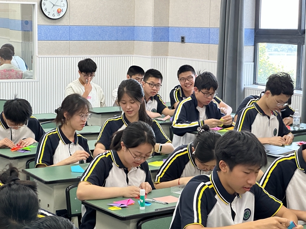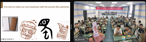 2025年6月11日上午,四川省新津中学和新西兰伯纳姆学校的师生齐聚一堂,通过ZOOM平台在线开展了一堂中西方文化交流的双向人文交流课。新津中学英语教师刘静向新西兰师生介绍了古蜀文明的发展脉络和典型纹饰,通过对“蜀”字的演变和蜀绣发展的介绍,凸显了古蜀先民格物致知、崇新尚美的精神,并指导新西兰师生设计古蜀文明元素的实用书签。伯纳姆学校教师Sarah则指导新西兰学生们介绍毛利文化中标志着新年开始的Matariki星团,并同步教授如何用折纸的方式做出Matariki用于节日装饰。双方师生相互展示了自己的作品,并进行了积极友好的交流互动。