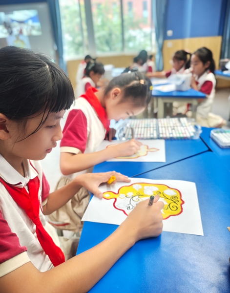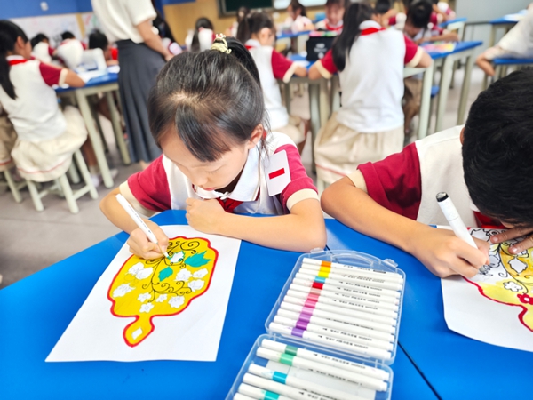 随后,在学校美术教师郑李楠的指导下,学生利用手中的马克笔和画纸,尝试绘制霍赫洛玛风格的装饰画。过程中,学生不仅学习了如何运用色彩和图案来表达情感,更在与外国同龄人的互动中,学会了欣赏不同的文化和艺术表现形式。