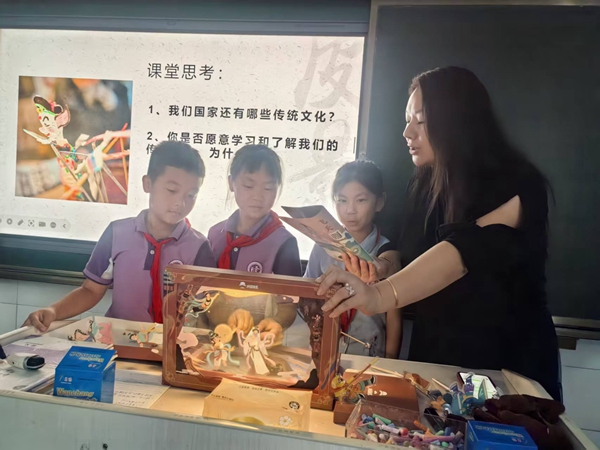 课程中,刘老师带领同学们学习了其他国家与皮影有关的历史文化,其中包括东南亚国家:印度尼西亚、泰国、柬埔寨等的皮影戏文化,还有西方国家的纸偶剧、手影表演、布偶戏等。