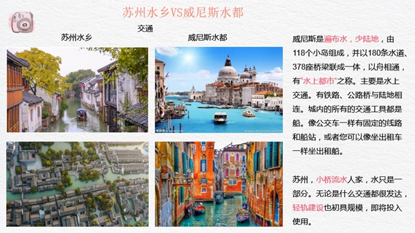 第二节课则深入“对比探究与思辨升华”。钱老师巧妙地将视角引回本土,引导学生们进行中外建筑的对比分析。气势恢宏的北京天安门广场与历史厚重的莫斯科红场有何异同?东方威尼斯——苏州的婉约水巷与意大利威尼斯的水城风光各自蕴含着怎样的人居智慧与文化密码?通过这些具体案例的比较,学生们不仅看到了建筑形式上的差异,更开始思考其背后深厚的历史、地理、人文因素。
