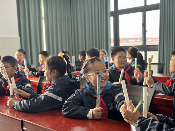教室里,小才子们早已跃跃欲试。在屏幕另一端“小教练们”耐心细致的同步指导下,大家兴致勃勃地开始了基础动作的模仿与练习。从最开始的生涩到逐渐熟练,小才子们全神贯注地尝试着棍子的传递、击打以及与同伴的节奏配合。一时间,教室里充满了木棍清脆的敲击声和小才子们成功后欢快的笑声,节奏明快的练习过程仿佛一场有趣的协作游戏,大家在亲身参与中深刻感受到了毛利文化所倡导的集体精神、协作之美与身体律动的快乐。