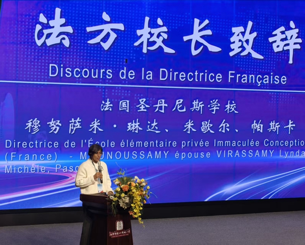 法国圣丹尼斯学校校长穆努萨米·琳达·米歇尔·帕斯卡女士在致辞中介绍了该校位于留尼汪岛的基本情况及其多语言、跨文化的办学特色。她特别提到学校开设的中文课程,并表示此次实地交流为学生提供了沉浸式感受中国文化、实践语言能力的宝贵机会,传递了“和平友谊、共建美好世界”的共同愿望。
