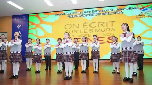 四川教育新闻成都1月28日讯(王丽娟)在中外人文交流日益密切的背景下,崇州七一实验小学法语班2025年秋季学期的课程,将语言学习与文化实践深度融合。本学期,学生们不仅系统掌握了法语基础知识,更在一系列文化交流活动中展现了风采。尤为亮眼的是,班级排演的法语歌曲《On écrit sur les murs》在第三届“合作·理解·共融”国际教育对话——“中法共育·丝路新程”中法教育对话暨人文交流活动中精彩上演,孩子们以清澈的嗓音与自信的演绎,赢得了中外嘉宾的赞赏,用艺术架起了一座小小的友谊之桥。